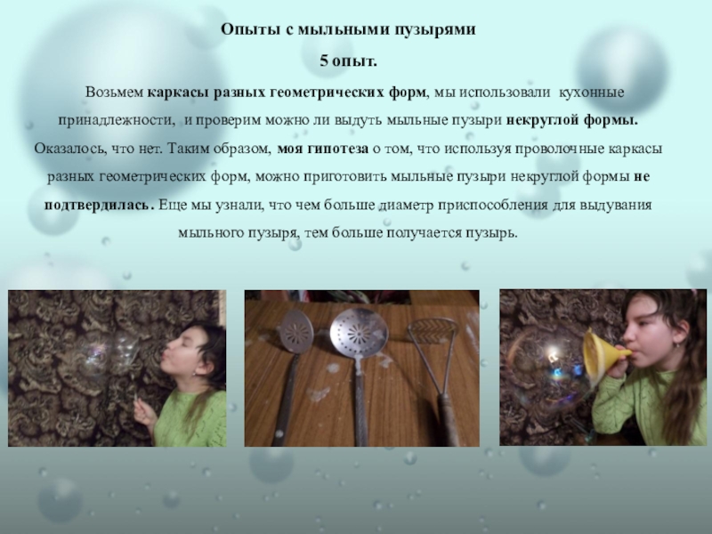 мы использовали кухонные принадлежности, и проверим можно ли выдуть мыльные пузыри некруглой формы. Оказалось, что нет. Таким образом, моя гипотеза о том, что используя проволочные каркасы разных геометрических форм, можно приготовить мыльные пузыри некруглой формы не подтвердилась. Еще мы узнали, что чем больше диаметр приспособления для выдувания мыльного пузыря, тем больше получается пузырь.