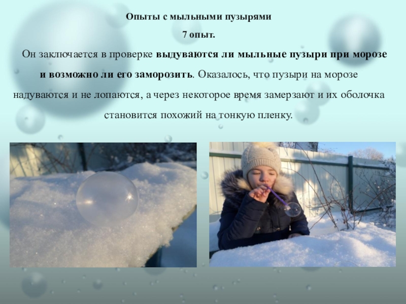 ли мыльные пузыри при морозе и возможно ли его заморозить. Оказалось, что пузыри на морозе надуваются и не лопаются, а через некоторое время замерзают и их оболочка становится похожий на тонкую пленку.