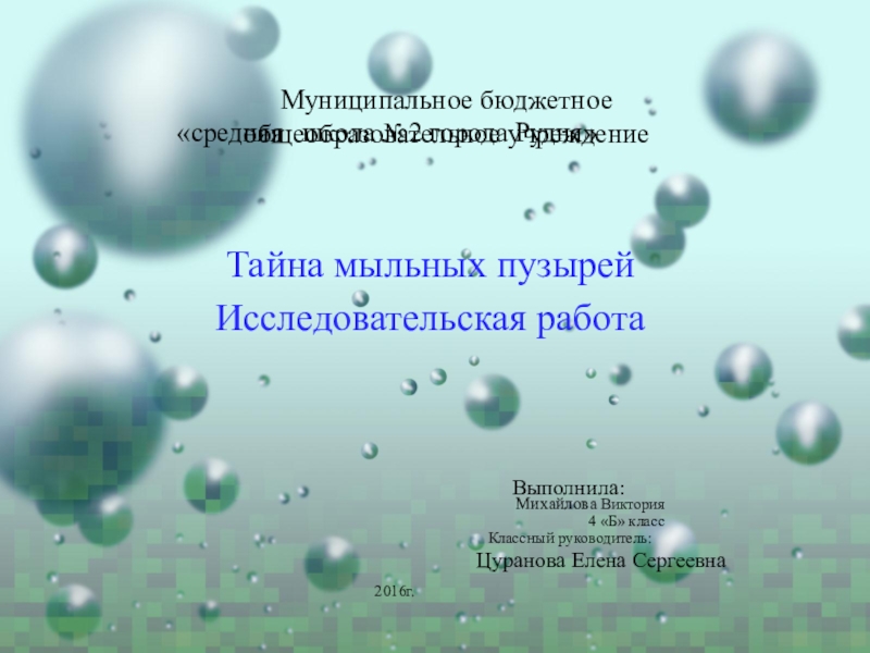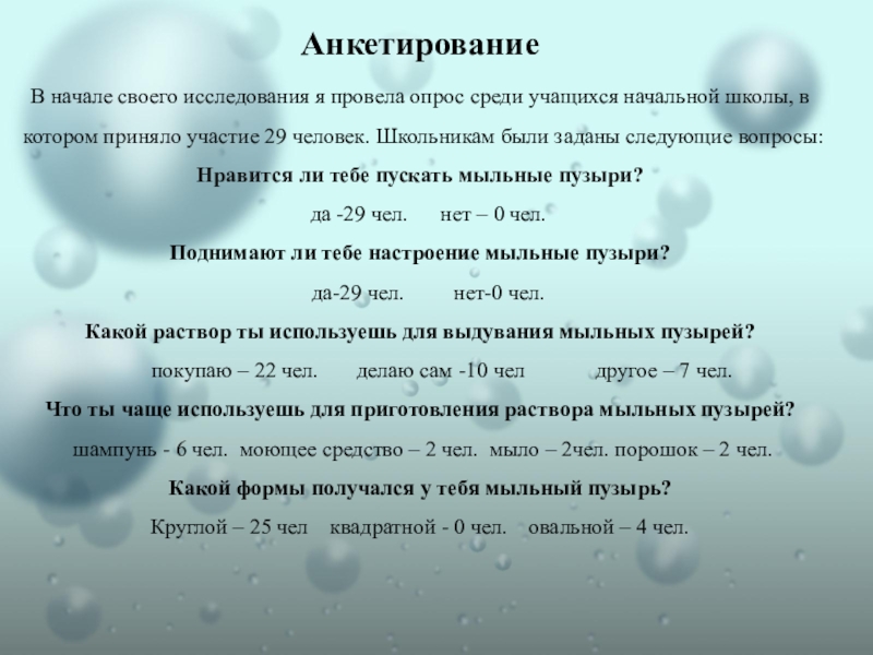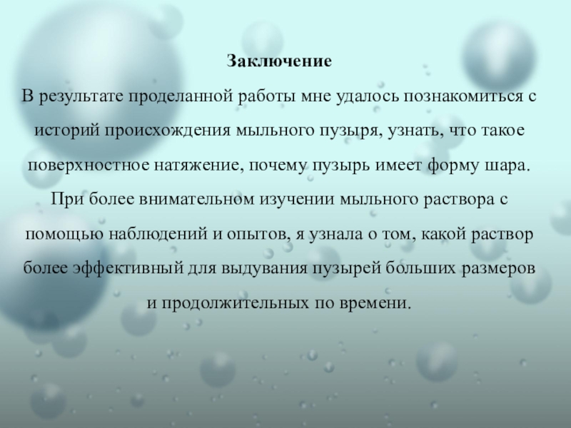 мыльного пузыря, узнать, что такое поверхностное натяжение, почему пузырь имеет форму шара. При более внимательном изучении мыльного раствора с помощью наблюдений и опытов, я узнала о том, какой раствор более эффективный для выдувания пузырей больших размеров и продолжительных по времени.