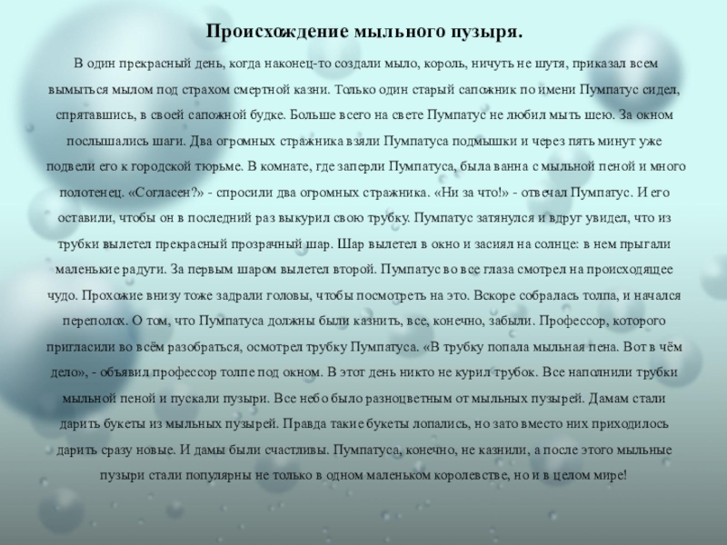 король, ничуть не шутя, приказал всем вымыться мылом под страхом смертной казни. Только один старый сапожник по имени Пумпатус сидел, спрятавшись, в своей сапожной будке. Больше всего на свете Пумпатус не любил мыть шею. За окном послышались шаги. Два огромных стражника взяли Пумпатуса подмышки и через пять минут уже подвели его к городской тюрьме. В комнате, где заперли Пумпатуса, была ванна с мыльной пеной и много полотенец. «Согласен?» - спросили два огромных стражника. «Ни за что!» - отвечал Пумпатус. И его оставили, чтобы он в последний раз выкурил свою трубку. Пумпатус затянулся и вдруг увидел, что из трубки вылетел прекрасный прозрачный шар. Шар вылетел в окно и засиял на солнце: в нем прыгали маленькие радуги. За первым шаром вылетел второй. Пумпатус во все глаза смотрел на происходящее чудо. Прохожие внизу тоже задрали головы, чтобы посмотреть на это. Вскоре собралась толпа, и начался переполох. О том, что Пумпатуса должны были казнить, все, конечно, забыли. Профессор, которого пригласили во всём разобраться, осмотрел трубку Пумпатуса. «В трубку попала мыльная пена. Вот в чём дело», - объявил профессор толпе под окном. В этот день никто не курил трубок. Все наполнили трубки мыльной пеной и пускали пузыри. Все небо было разноцветным от мыльных пузырей. Дамам стали дарить букеты из мыльных пузырей. Правда такие букеты лопались, но зато вместо них приходилось дарить сразу новые. И дамы были счастливы. Пумпатуса, конечно, не казнили, а после этого мыльные пузыри стали популярны не только в одном маленьком королевстве, но и в целом мире!