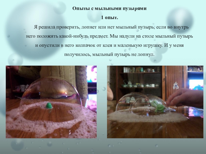 мыльных пузырей. Мне это тоже удалось. Оказалось, что для создания различных фигур из мыльных пузырей на столе, его поверхность должна быть хорошо смочена мыльным раствором.