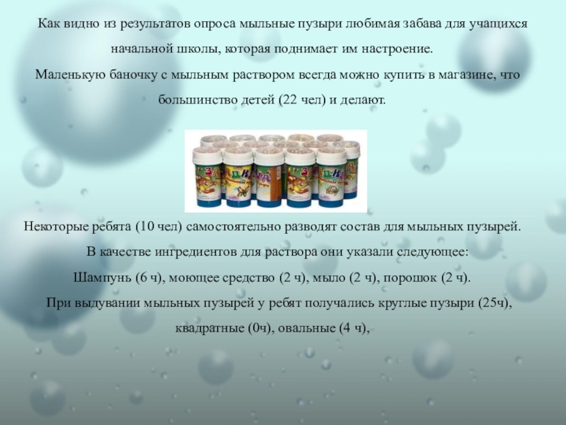 Слайд 11 Как видно из результатов опроса мыльные пузыри любимая