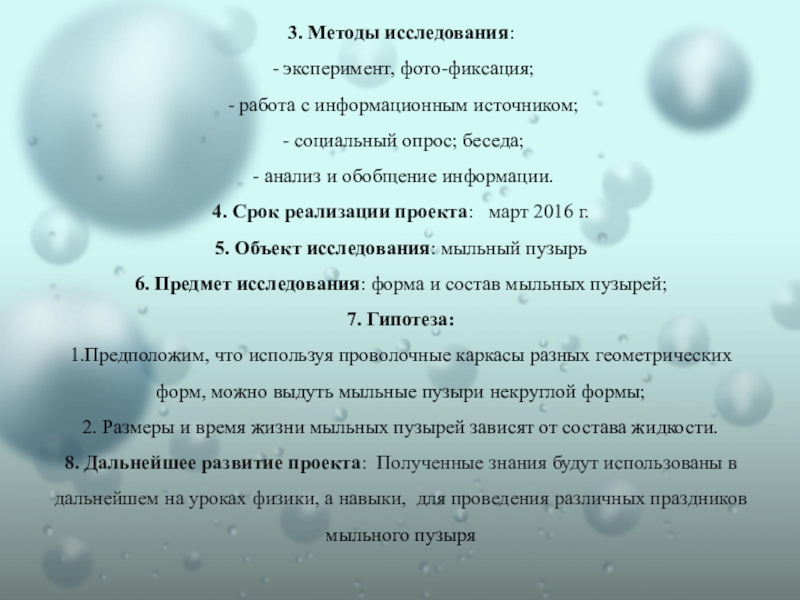 6. Предмет исследования: форма и состав мыльных пузырей;