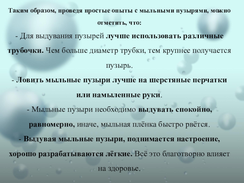Слайд 24Таким образом, проведя простые опыты с мыльными пузырями, можно отметить, что: