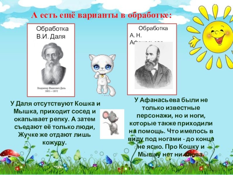 У Даля отсутствуют Кошка и Мышка, приходит сосед и окапывает репку. А затем съедают её только люди, Жучке же отдают лишь кожуру.