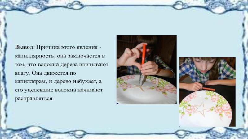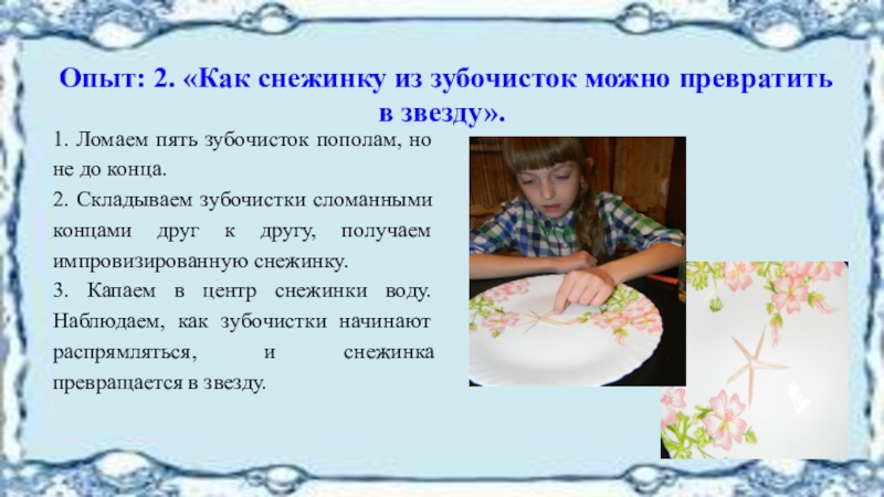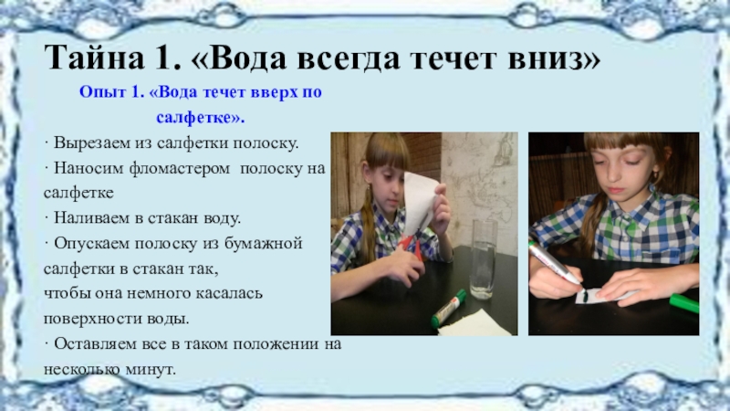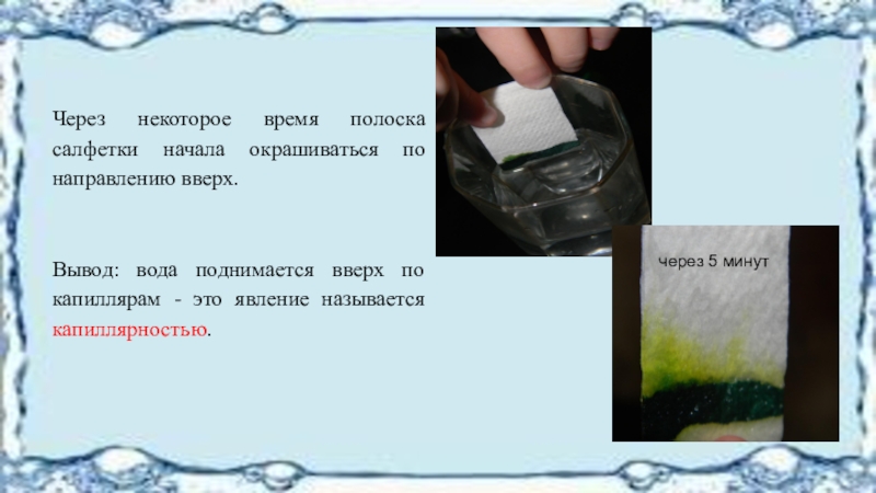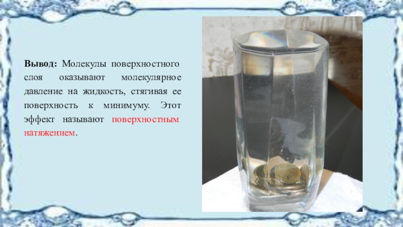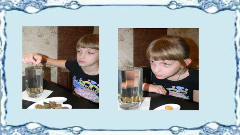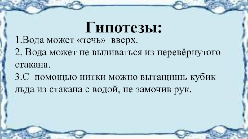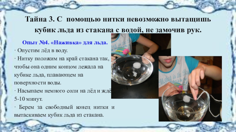 · Нитку положим на край стакана так, чтобы она одним концом лежала на кубике льда, плавающем на поверхности воды.