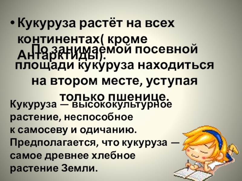 Кукуруза растёт на всех континентах( кроме Антарктиды).