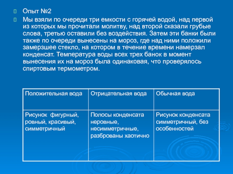 над первой из которых мы прочитали молитву, над второй сказали грубые слова, третью оставили без воздействия. Затем эти банки были также по очереди вынесены на мороз, где над ними положили замерзшее стекло, на котором в течение времени намерзал конденсат. Температура воды всех трех банок в момент вынесения их на мороз была одинаковая, что проверялось спиртовым термометром.