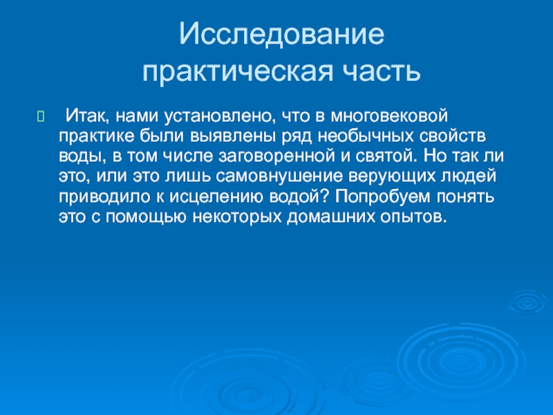Определить, обладает ли вода свойством целительно воздействовать на организм человека.
