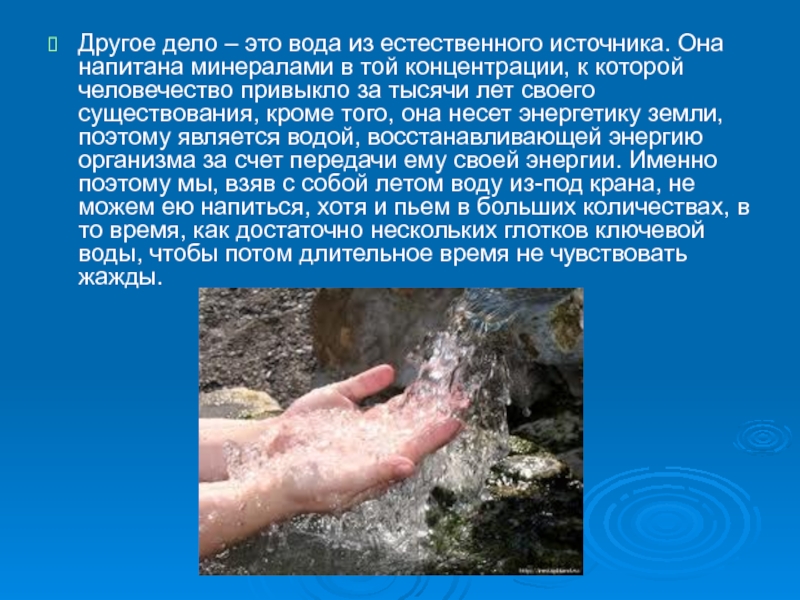 Слайд 5Другое дело – это вода из естественного источника. Она напитана минералами