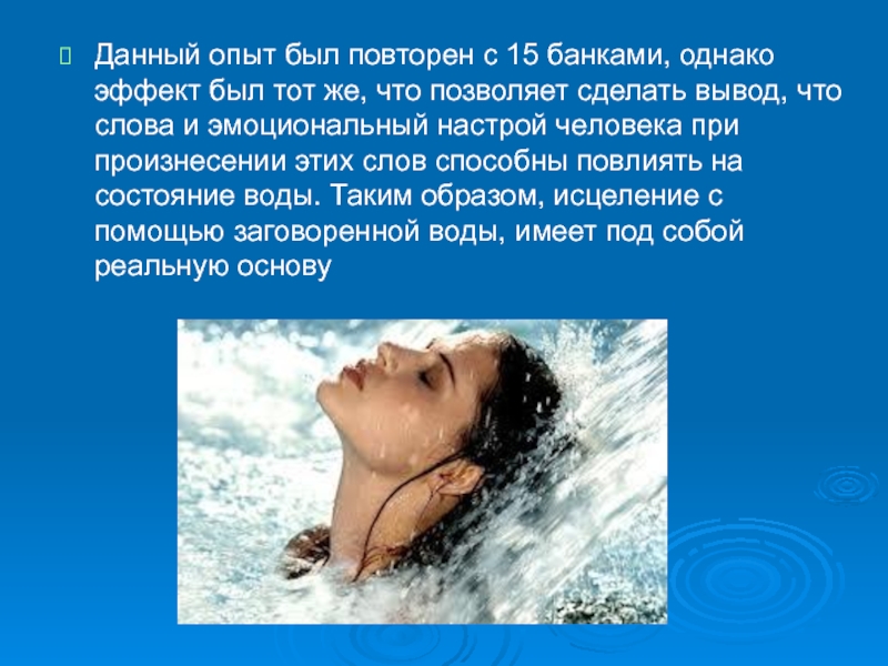 же, что позволяет сделать вывод, что слова и эмоциональный настрой человека при произнесении этих слов способны повлиять на состояние воды. Таким образом, исцеление с помощью заговоренной воды, имеет под собой реальную основу