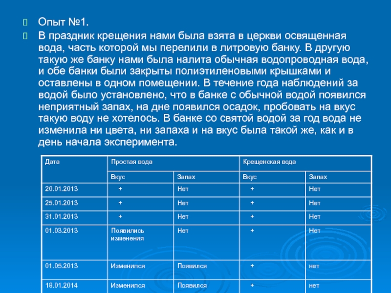 часть которой мы перелили в литровую банку. В другую такую же банку нами была налита обычная водопроводная вода, и обе банки были закрыты полиэтиленовыми крышками и оставлены в одном помещении. В течение года наблюдений за водой было установлено, что в банке с обычной водой появился неприятный запах, на дне появился осадок, пробовать на вкус такую воду не хотелось. В банке со святой водой за год вода не изменила ни цвета, ни запаха и на вкус была такой же, как и в день начала эксперимента.