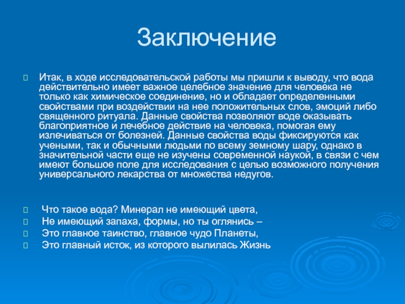 Итак, в ходе исследовательской работы мы пришли к выводу, что вода
