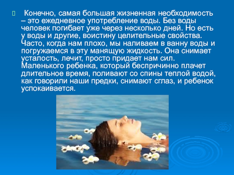 воды человек погибает уже через несколько дней. Но есть у воды и другие, воистину целительные свойства. Часто, когда нам плохо, мы наливаем в ванну воды и погружаемся в эту манящую жидкость. Она снимает усталость, лечит, просто придает нам сил. Маленького ребенка, который беспричинно плачет длительное время, поливают со спины теплой водой, как говорили наши предки, снимают сглаз, и ребенок успокаивается.