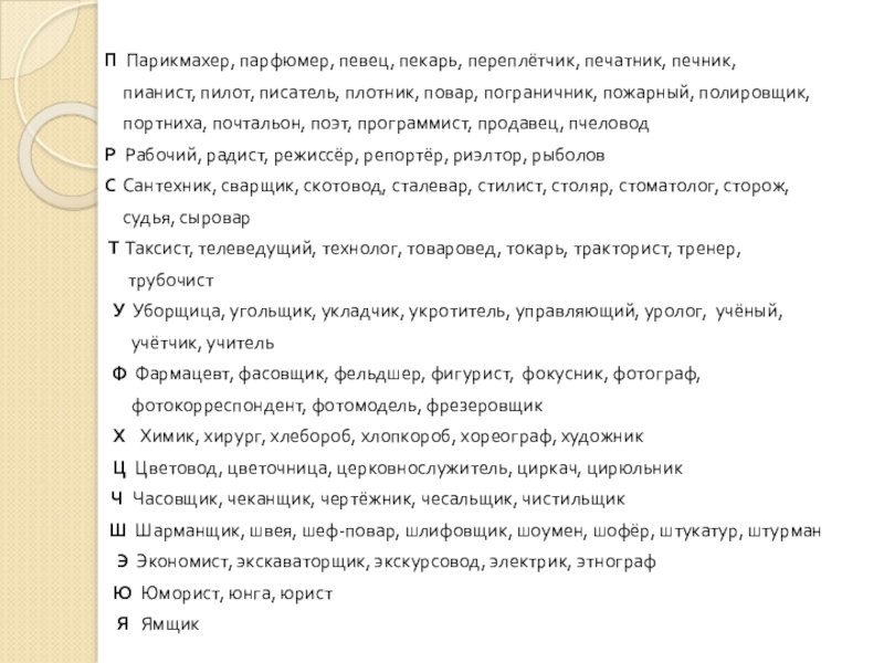 П Парикмахер, парфюмер, певец, пекарь, переплётчик, печатник, печник,