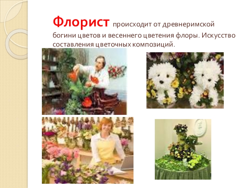 Слайд 10Флорист происходит от древнеримской богини цветов и весеннего цветения флоры. Искусство