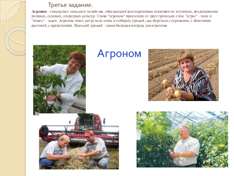 Агроном - специалист сельского хозяйства, обладающий всесторонними знаниями по изучению, возделыванию полевых, садовых, огородных культур. Слово "агроном" произошло от двух греческих слов: "агрос" - поле и "номос" - закон. Агроном знает, когда надо сеять и собирать урожай, как бороться с сорняками, с болезнями растений, с вредителями. Высокий урожай - самая большая награда для агронома.