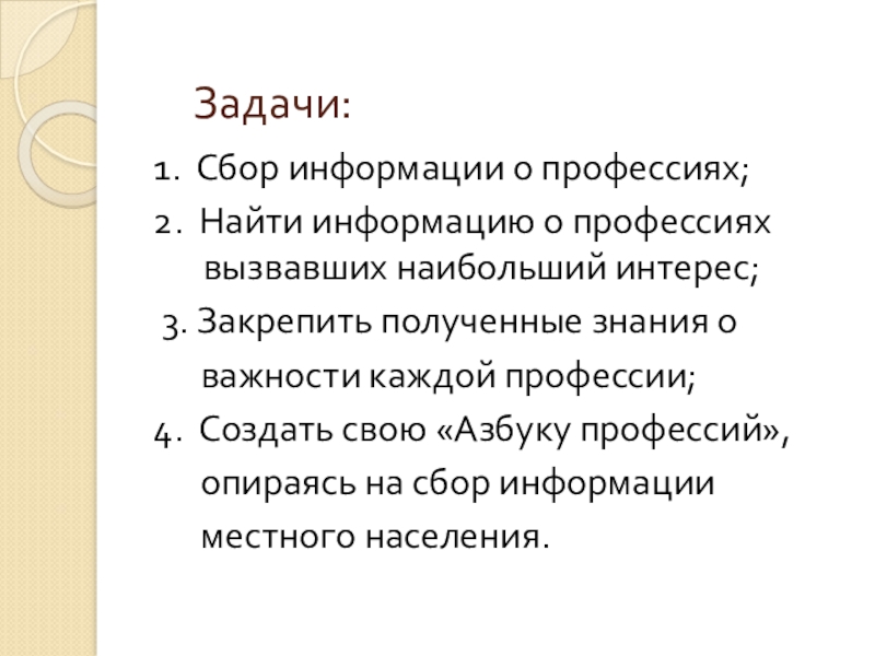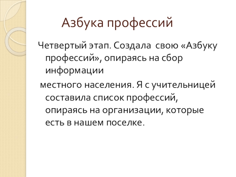местного населения. Я с учительницей составила список профессий, опираясь на организации, которые есть в нашем поселке.