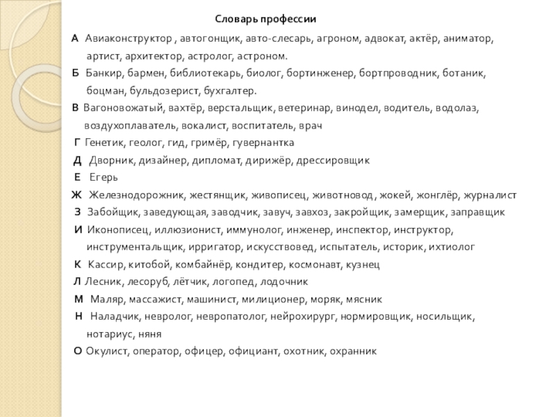 А Авиаконструктор , автогонщик, авто-слесарь, агроном, адвокат, актёр, аниматор,