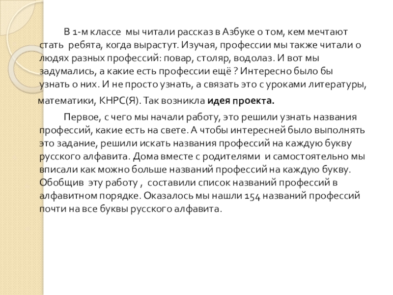 В 1-м классе мы читали рассказ в Азбуке о том, кем мечтают стать ребята, когда вырастут. Изучая, профессии мы также читали о людях разных профессий: повар, столяр, водолаз. И вот мы задумались, а какие есть профессии ещё ? Интересно было бы узнать о них. И не просто узнать, а связать это с уроками литературы,