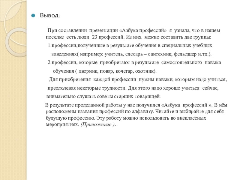 В результате проделанной работы у нас получился «Азбука профессий ». В нём расположены названия профессий по алфавиту. Читайте и выбирайте для себя будущую профессию. Эту работу можно использовать во внеклассных мероприятиях. (Приложение ).