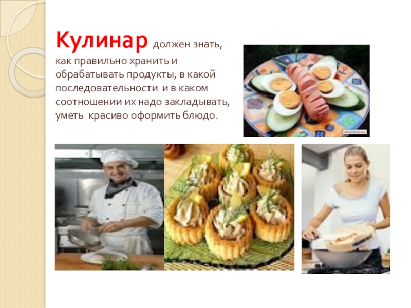 Слайд 9Кулинар должен знать, как правильно хранить и обрабатывать продукты, в какой