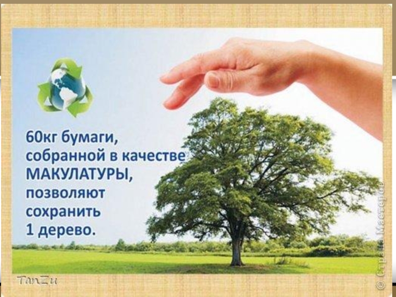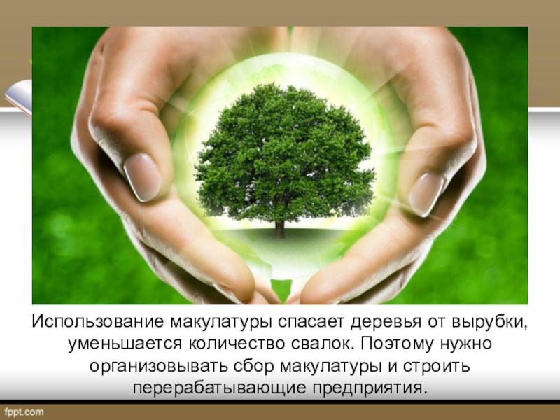 Слайд 23Использование макулатуры спасает деревья от вырубки, уменьшается количество свалок. Поэтому нужно
