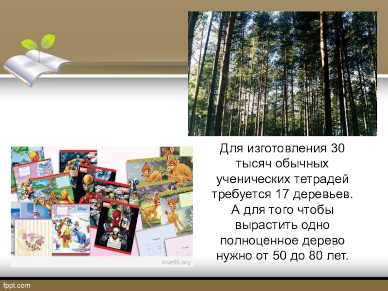 Слайд 6Для изготовления 30 тысяч обычных ученических тетрадей требуется 17 деревьев. А