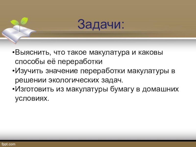 Задачи:Выяснить, что такое макулатура и каковы способы её переработкиИзучить значение переработки макулатуры в решении экологических задач.Изготовить из