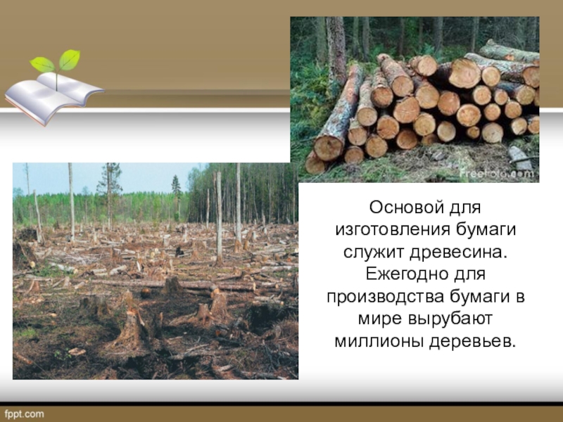 Слайд 5Основой для изготовления бумаги служит древесина. Ежегодно для производства бумаги в