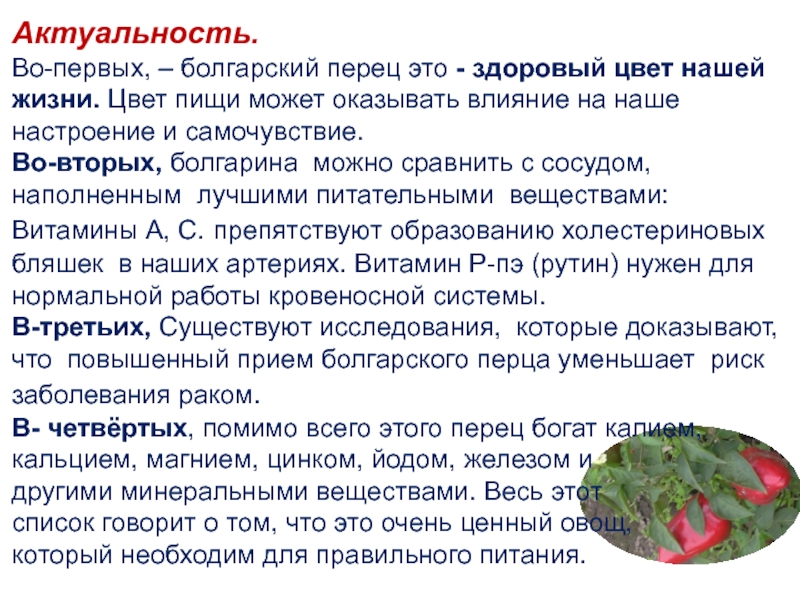 Во-вторых, болгарина можно сравнить с сосудом, наполненным лучшими питательными веществами: Витамины А, С. препятствуют образованию холестериновых бляшек в наших артериях. Витамин Р-пэ (рутин) нужен для нормальной работы кровеносной системы.