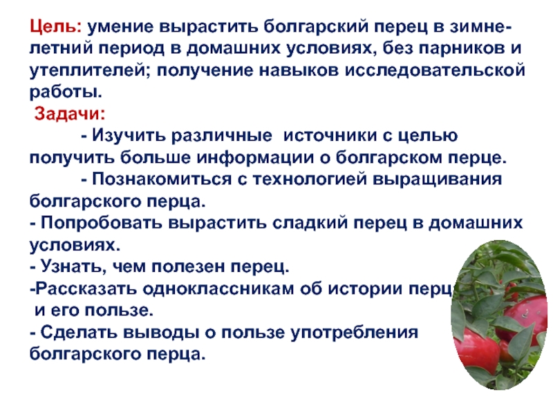 Слайд 2Цель: умение вырастить болгарский перец в зимне-летний период в домашних условиях,