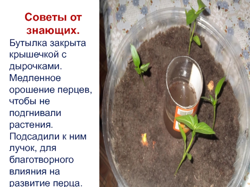 Бутылка закрыта крышечкой с дырочками. Медленное орошение перцев, чтобы