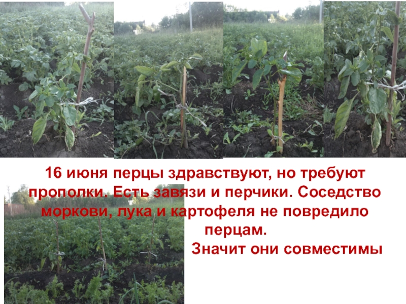 Слайд 1816 июня перцы здравствуют, но требуют прополки. Есть завязи и перчики.