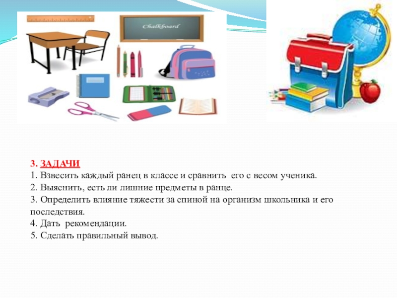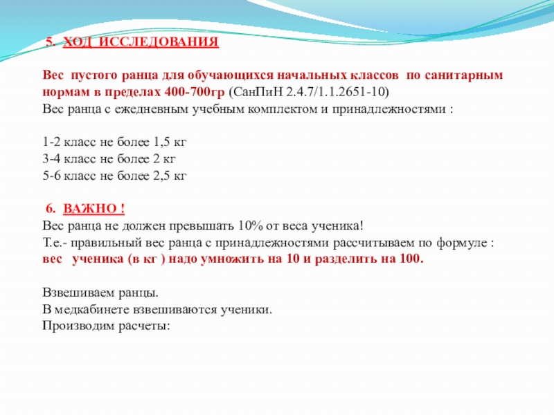 1. Выяснить, соответствует ли масса ранца младшего школьника, третьеклассника, санитарным нормам.