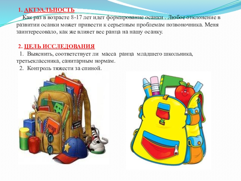 лет идет формирование осанки . Любое отклонение в развитии осанки может привести к серьезным проблемам позвоночника. Меня заинтересовало, как же влияет вес ранца на нашу осанку.