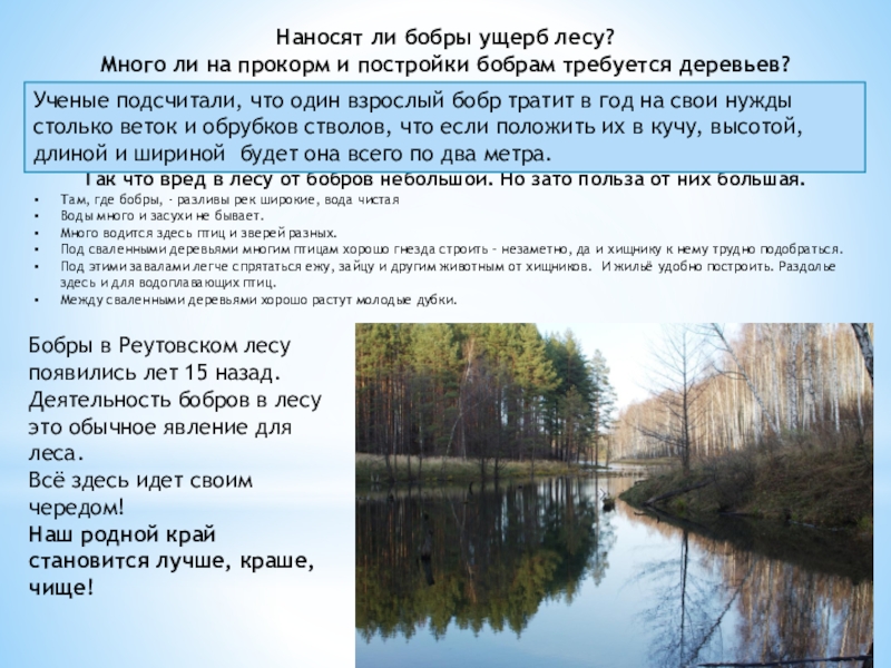Так что вред в лесу от бобров небольшой. Но зато польза от них большая.