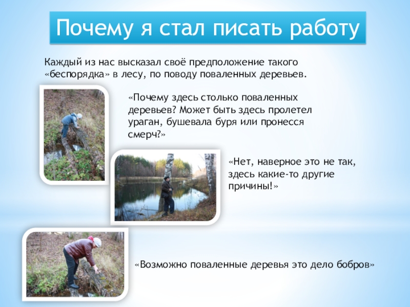 Меня заинтересовало это явление в лесу, захотелось точно узнать, изучить причины «беспорядка» и всё исследовать, записать.