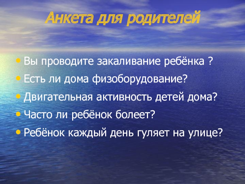 Анкета для родителей Вы проводите закаливание ребёнка ?Есть ли дома физоборудование?Двигательная активность детей дома?Часто ли ребёнок болеет?Ребёнок