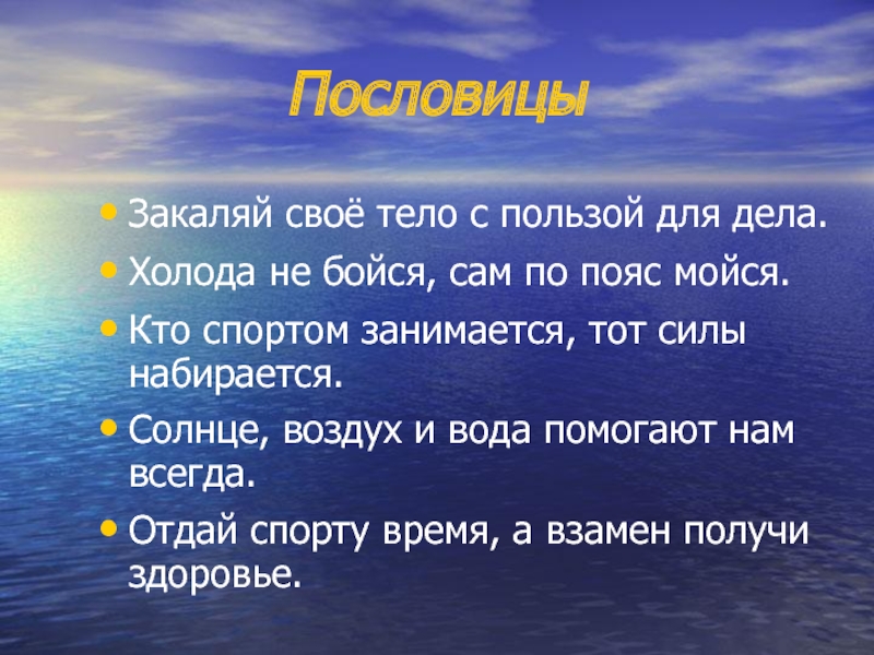 ПословицыЗакаляй своё тело с пользой для дела.Холода не бойся, сам по пояс мойся.Кто спортом занимается, тот силы