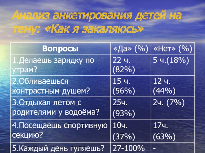 Слайд 18Анализ анкетирования детей на тему: «Как я закаляюсь»
