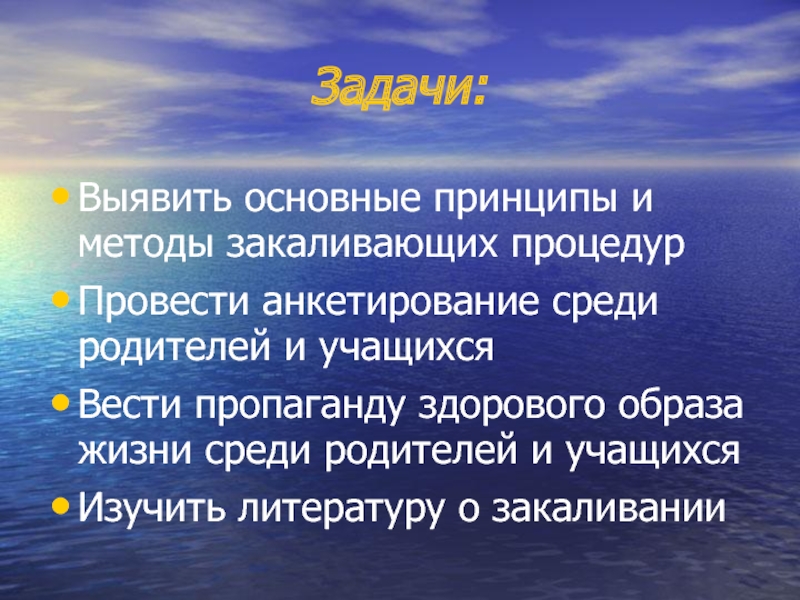 Задачи:Выявить основные принципы и методы закаливающих процедурПровести анкетирование среди родителей и учащихся Вести пропаганду здорового образа жизни