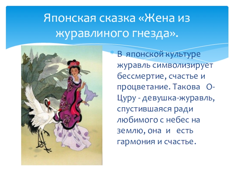 счастье и процветание. Такова О-Цуру - девушка-журавль, спустившаяся ради любимого с небес на землю, она и есть гармония и счастье.
