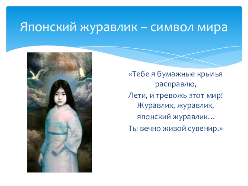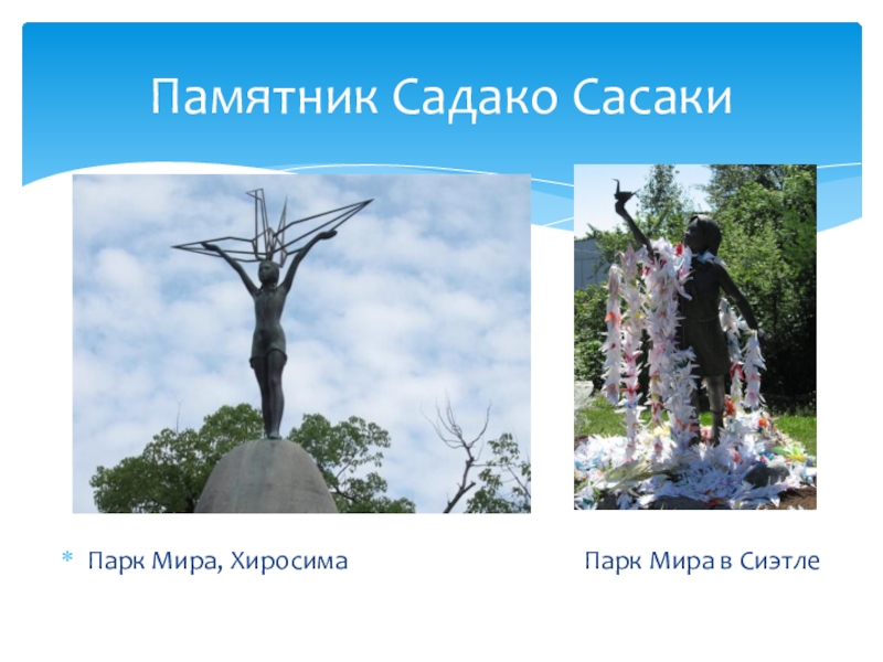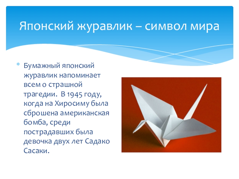 трагедии. В 1945 году, когда на Хиросиму была сброшена американская бомба, среди пострадавших была девочка двух лет Садако Сасаки.