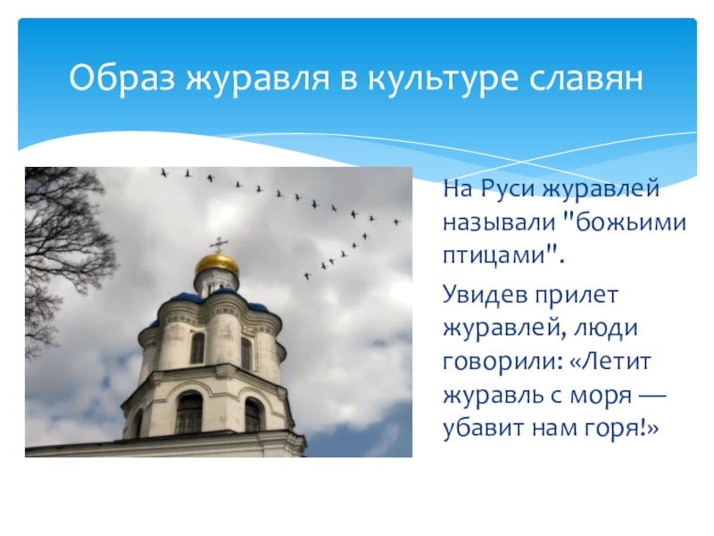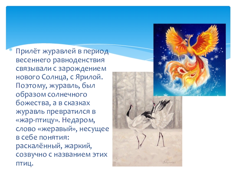 Слайд 21Прилёт журавлей в период весеннего равноденствия связывали с зарождением нового Солнца,