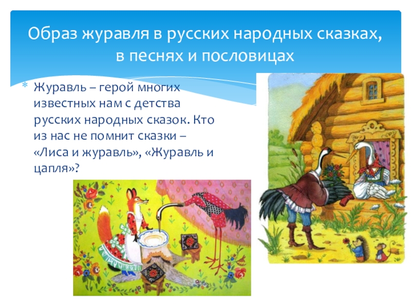 Слайд 24Образ журавля в русских народных сказках, в песнях и пословицах