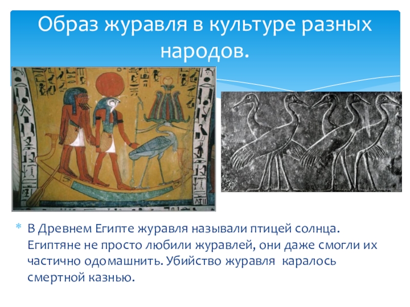 солнца. Египтяне не просто любили журавлей, они даже смогли их частично одомашнить. Убийство журавля каралось смертной казнью.