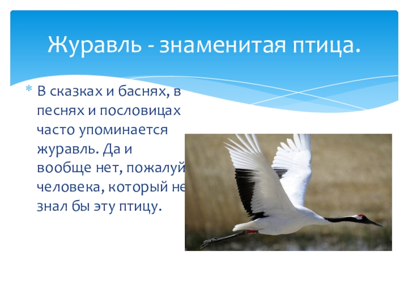часто упоминается журавль. Да и вообще нет, пожалуй, человека, который не знал бы эту птицу.