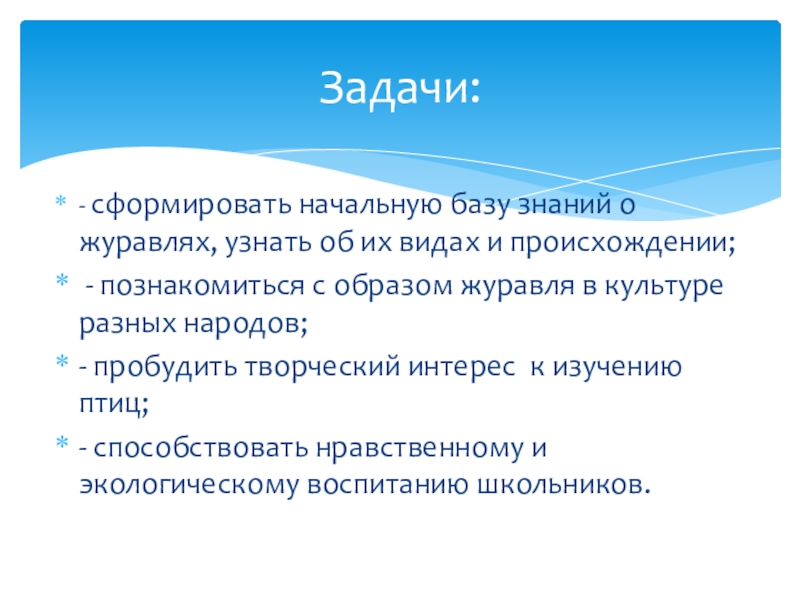 Слайд 6- сформировать начальную базу знаний о журавлях, узнать об их видах