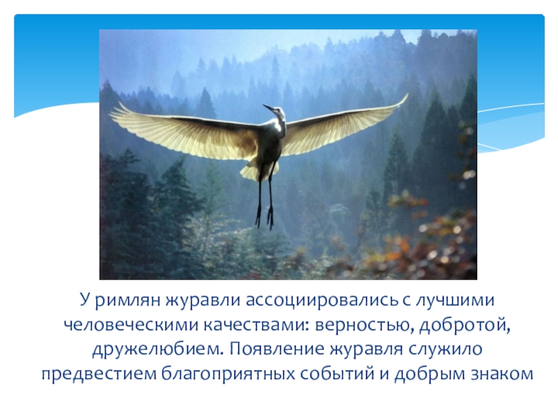 Слайд 16У римлян журавли ассоциировались с лучшими человеческими качествами: верностью, добротой, дружелюбием.